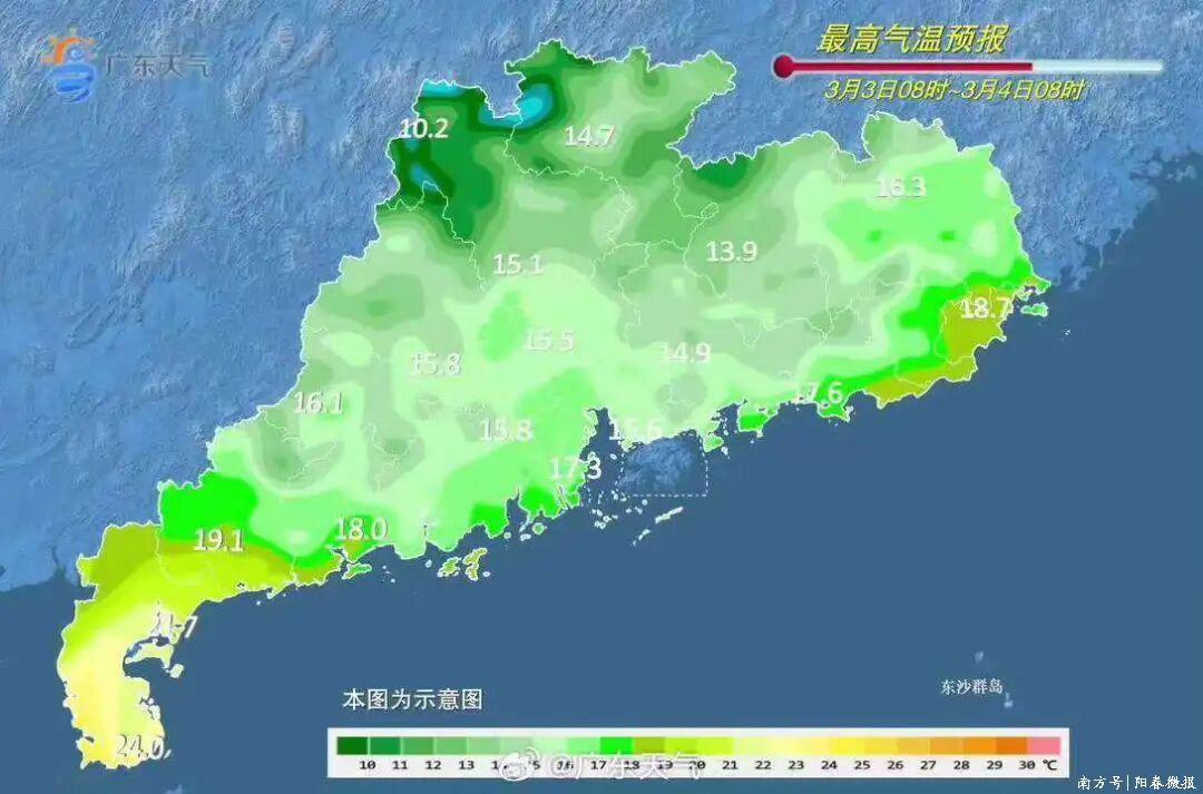 据@广东天气预计,2026年广东3月气候与近30年历史同期相比: